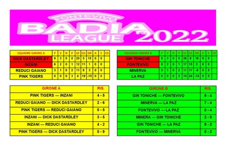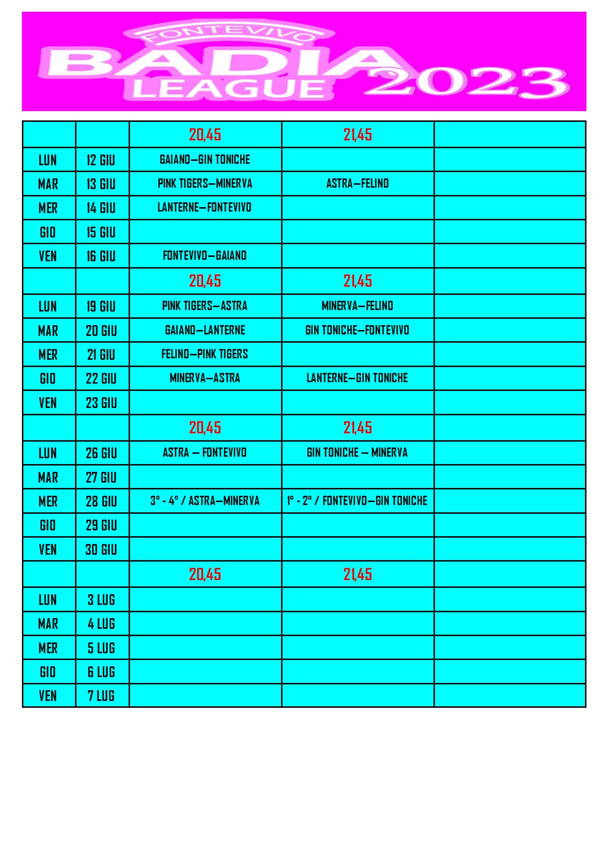 MINERVA, FONTEVIVO, ASTRA, GIN TONICHE, FELINO, LANTERNE, PINK TIGERS, GAIANO