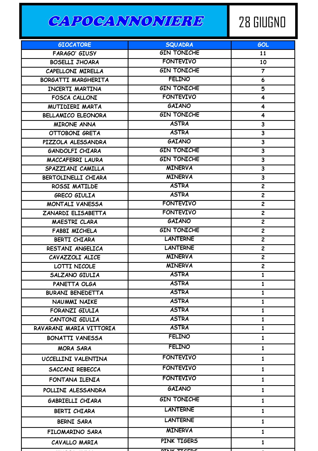 CAPOCANNONIERE: FARAGO' GIUSY - 11 GOL (GIN TONICHE)
