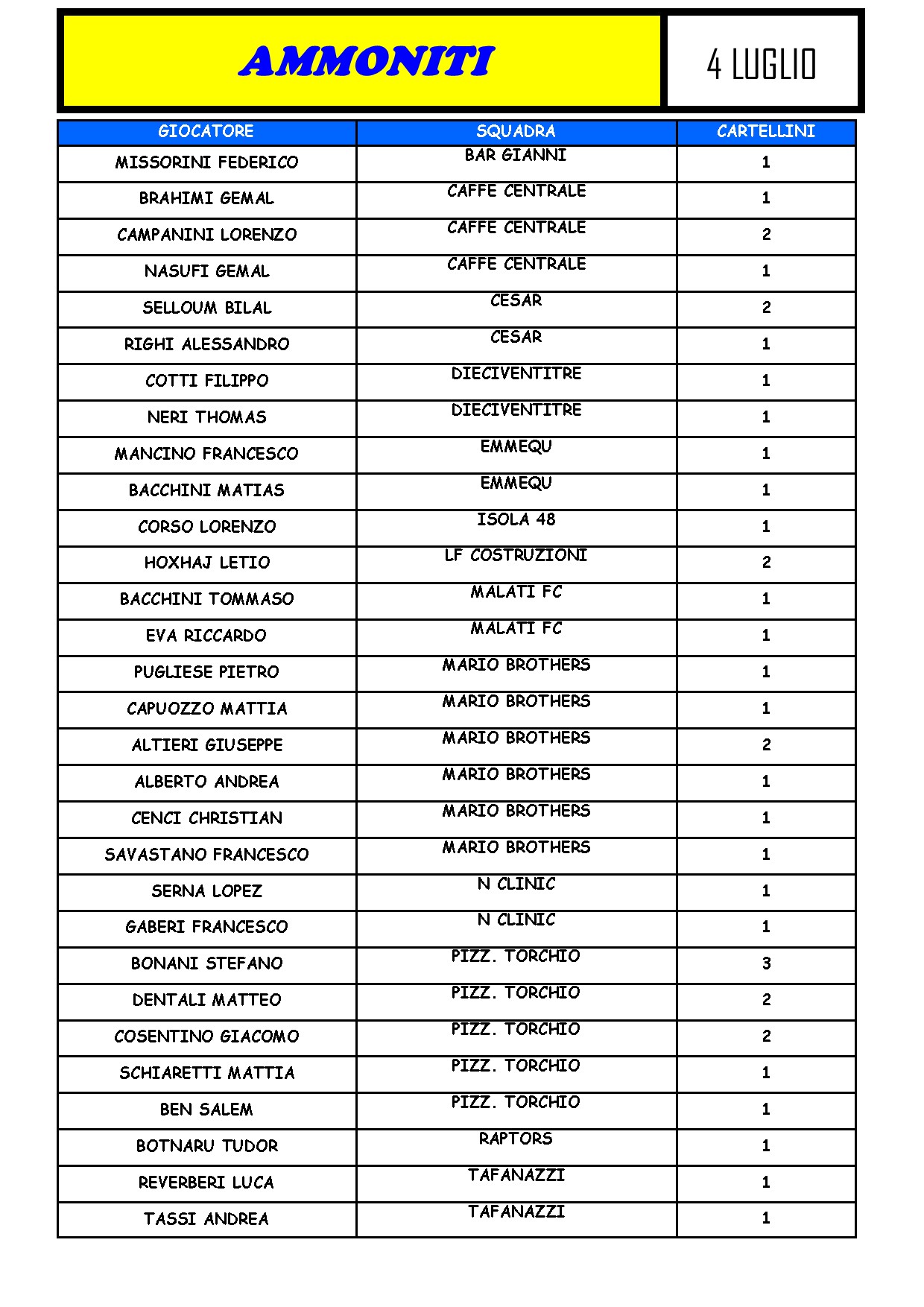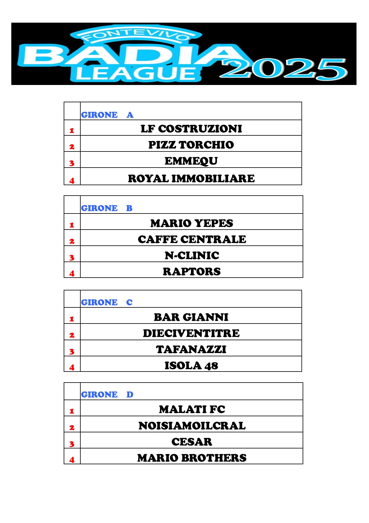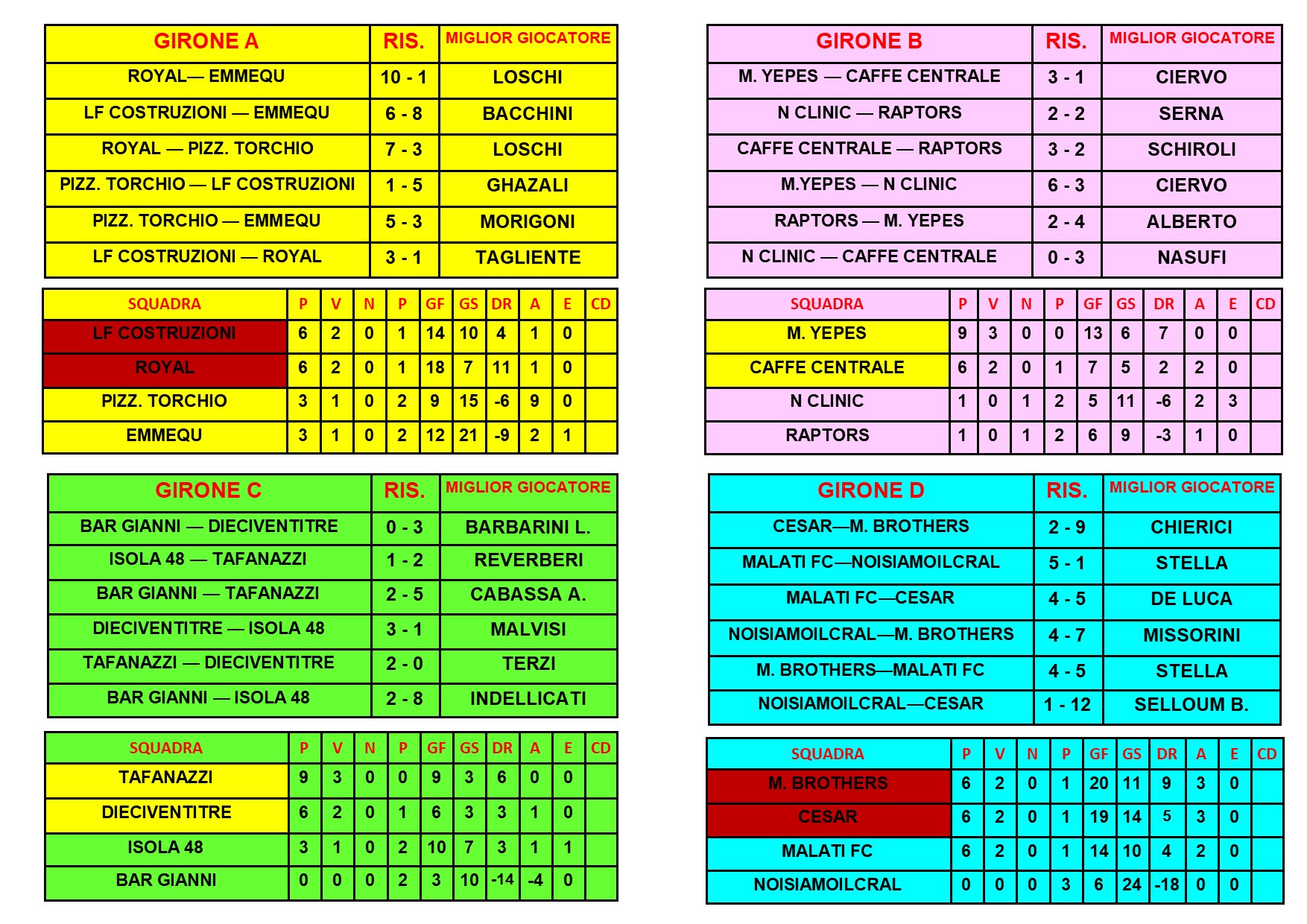 CAFFE CENTRALE, PIZZ. IL TORCHIO, ROYAL IMMOBILIARE, EMMEQU, TAFANAZZI, DIECIVENTITRE, ISOLA 48, N-CLINIC, LF COSTRUZIONI, BAR GIANNI, CESAR, NOISIAMOILCRAL, MARIO YEPES, MARIO BROTHERS, RAPTOR, MALATI FC
