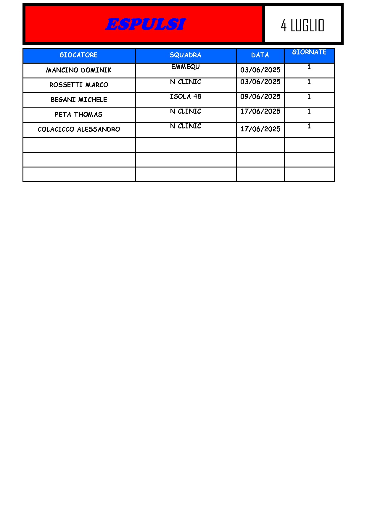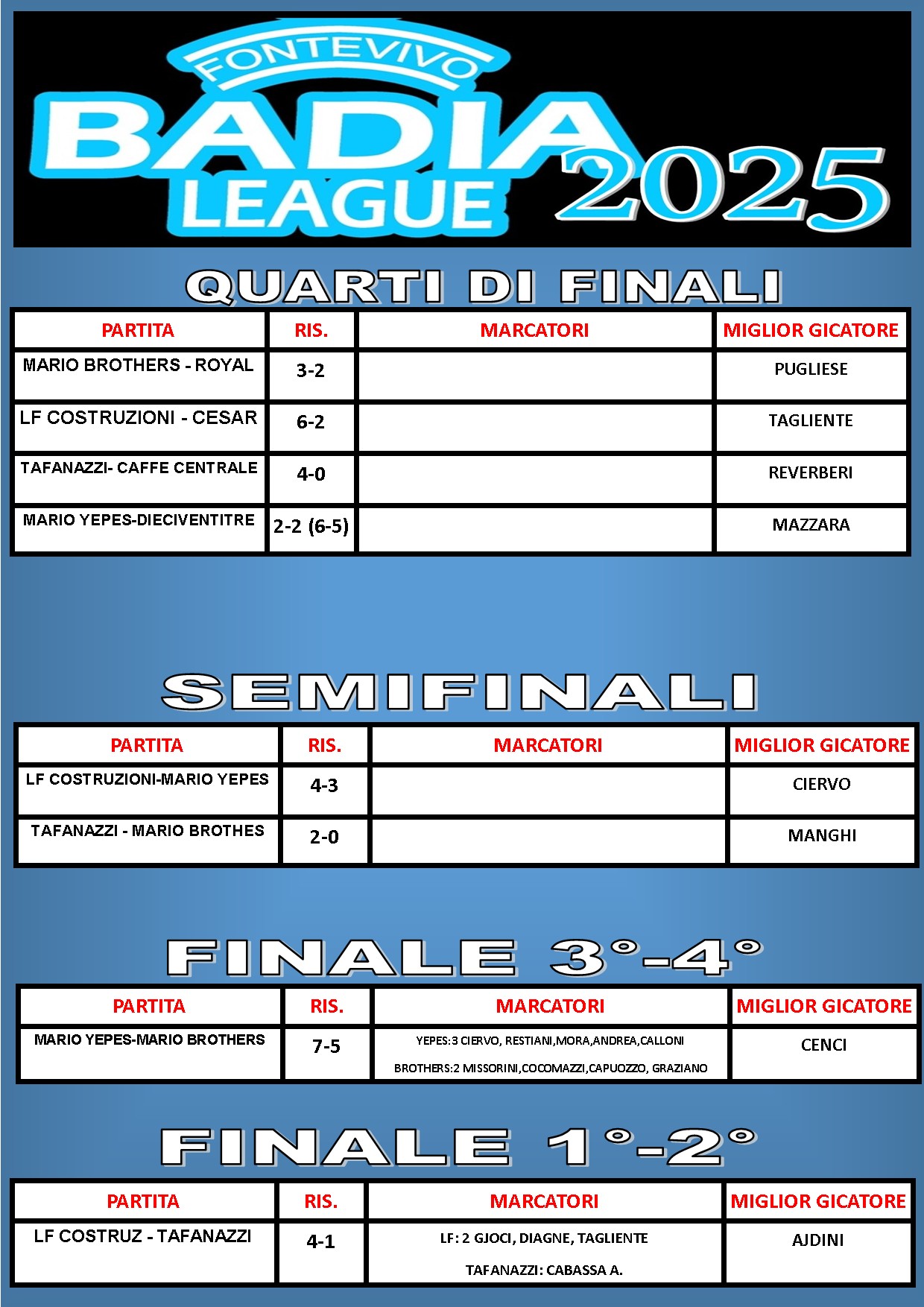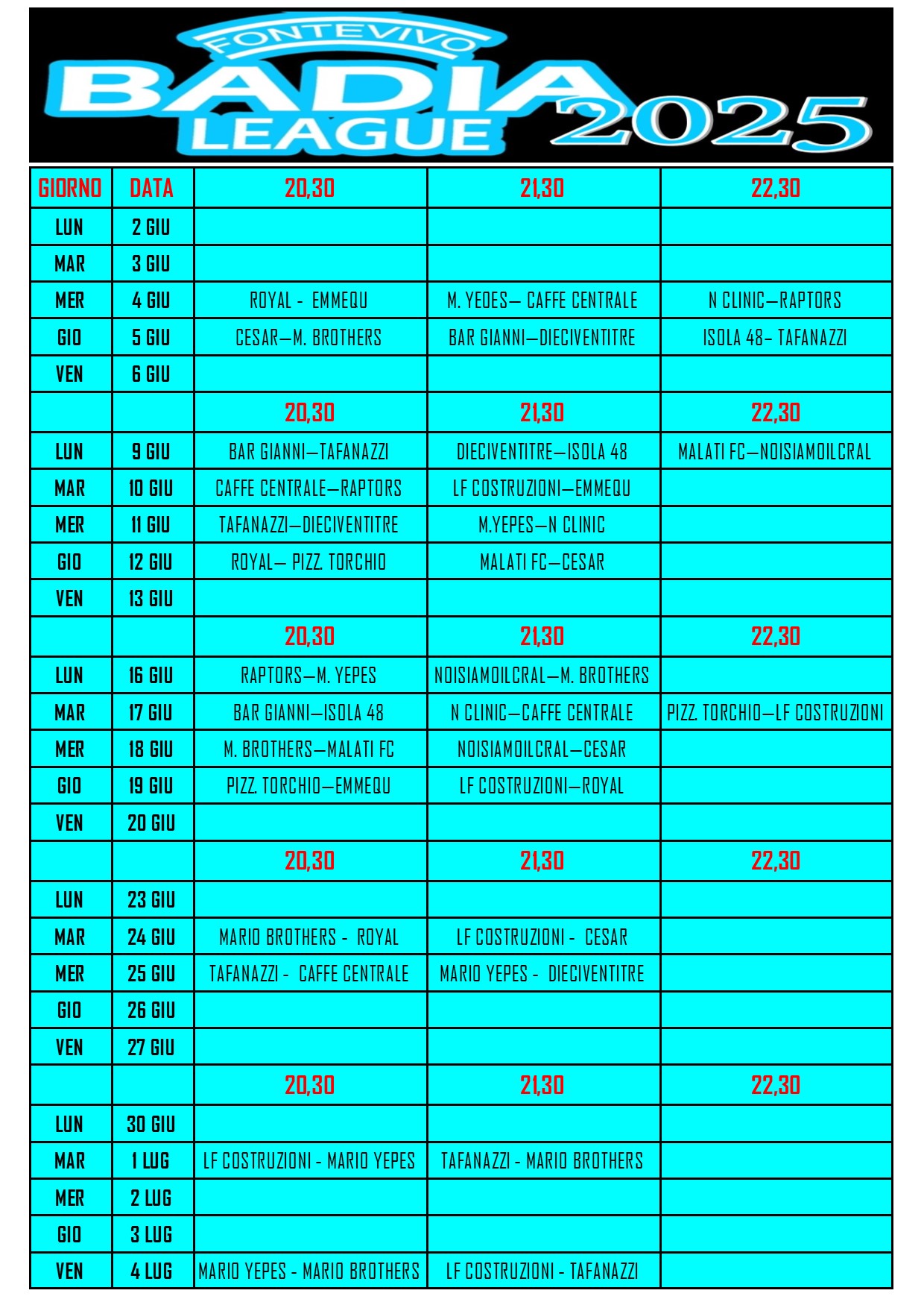 CAFFE CENTRALE, PIZZ. IL TORCHIO, ROYAL IMMOBILIARE, EMMEQU, TAFANAZZI, DIECIVENTITRE, ISOLA 48, N-CLINIC, LF COSTRUZIONI, BAR GIANNI, CESAR, NOISIAMOILCRAL, MARIO YEPES, MARIO BROTHERS, RAPTOR, MALATI FC