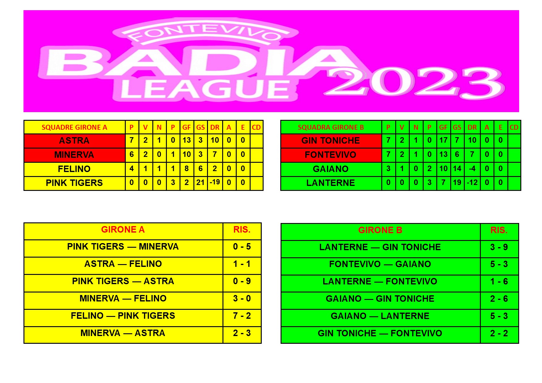 MINERVA, FONTEVIVO, ASTRA, GIN TONICHE, FELINO, LANTERNE, PINK TIGERS, GAIANO
